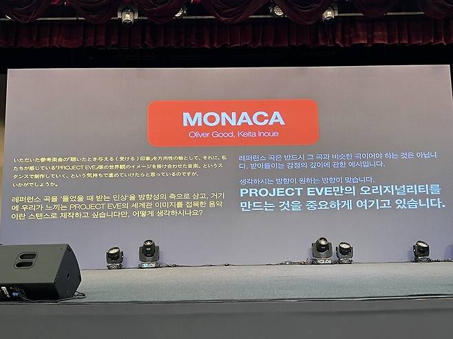 모나카는 니어 오토마타의 BGM 제작에 참여한 곳으로도 유명한 스튜디오다. 황주은 디렉터는 먼저 모나카가 만드는 BGM이 어떤 느낌일지 시험하는 측면에서 가볍게 3개의 샘플을 제작하는 것으로 시작했다. 그나 모나카에 요청한 곡은 일반적인 느낌의 메인 테마, 최종 보스전 느낌의 곡, 그리고 엔드 크레딧 3곡이었다. 3곡을 요청하면서 황주은 디렉터가 한 건 게임의 방향성과 이미지를 전달하는 정도에 불과했다.