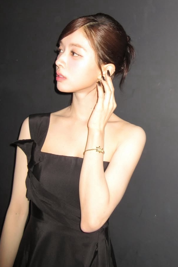오프숄더 스타일의 드레스로 여성스러운 곡선을 살렸고, 미니멀한 주얼리와 깔끔한 업스타일 헤어로 정제된 분위기를 연출했습니다.