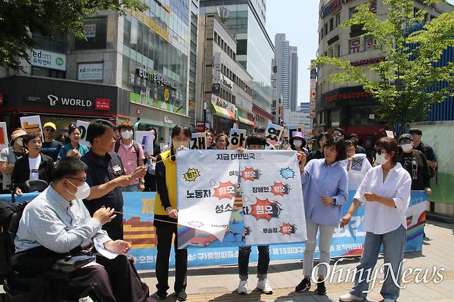 김지영 퀴어축제조직위 공동대표는 "서울은 장소를 빼앗겼고 춘천도 장소 사용이 불허됐다"며 "대구는 퀴어문화반대대책본부라는 이름을 세워 우리를 향한 혐오의 공세를 더욱 높이고 있다"고 지적했다.