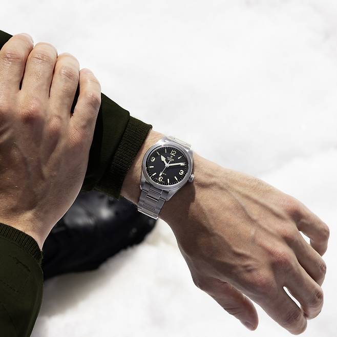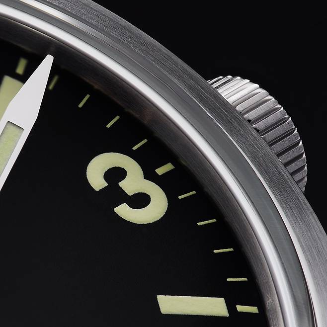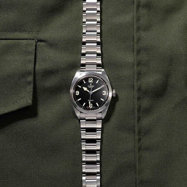 2022년 새롭게 선보이는 레인저 모델은 1960년대 중반 이후로 등장한 레인저 컬렉션의 특징적인 다이얼 디자인을 계승합니다. 매트한 블랙 다이얼 바탕에 A등급 슈퍼루미노바를 도포한 12-3-6-9 아라비아 숫자와 바형의 인덱스를 번갈아 사용하면서 창을 연상시키는 핸즈와 방패 문양의 브랜드 로고까지 오리지널의 풍모를 고스란히 느낄 수 있습니다. 날짜창을 생략하긴 했지만 다이얼의 디테일과 케이스 및 브레이슬릿까지 전체적인 모습은 1960년대 말 제작된 특정 레인저 모델(Ref. 7966)을 쏙 빼 닮아 더욱 눈길을 끕니다.