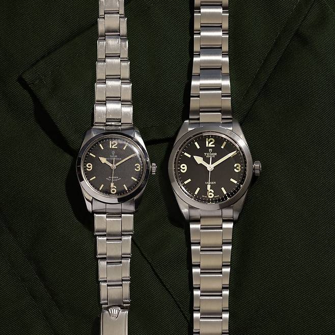 참고로 레인저라는 이름이 처음 쓰이게 된 시점은 훨씬 전인 1929년으로 거슬러 올라갑니다. 브랜드 창립자인 한스 빌스도르프가 튜더 트레이드마크를 등록한지 3년만에 레인저도 등록 신청을 완료한 것입니다. 그 후 레인저 모델은 클래식한 토노형 케이스의 1940년대 드레스 워치부터 리벳 디테일이 돋보이는 스틸 브레이슬릿 형태의 1960년대 툴 워치(이 또한 튜더 장미 로고를 새긴 버전과 방패 로고를 새긴 후속 버전으로 나뉨), 케이스 일체형 브레이슬릿을 장착한 한층 볼드한 형태의 1970년대 레인저 II 등 비교적 다양한 디자인으로 재해석되어 튜더의 다른 다이버 워치(ex. 블랙 베이) 제품군과 차별화된 개성으로 살아남았습니다.