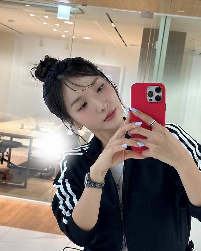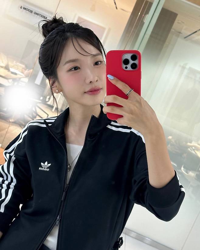 얇은 이너탑과 함께 매치하면서도 아우터 지퍼는 절반만 올려 적당한 여유를 줬고, 잔잔한 물결 앞머리와 깔끔한 올림머리가 룩 전체의 밸런스를 잡아줬어요.