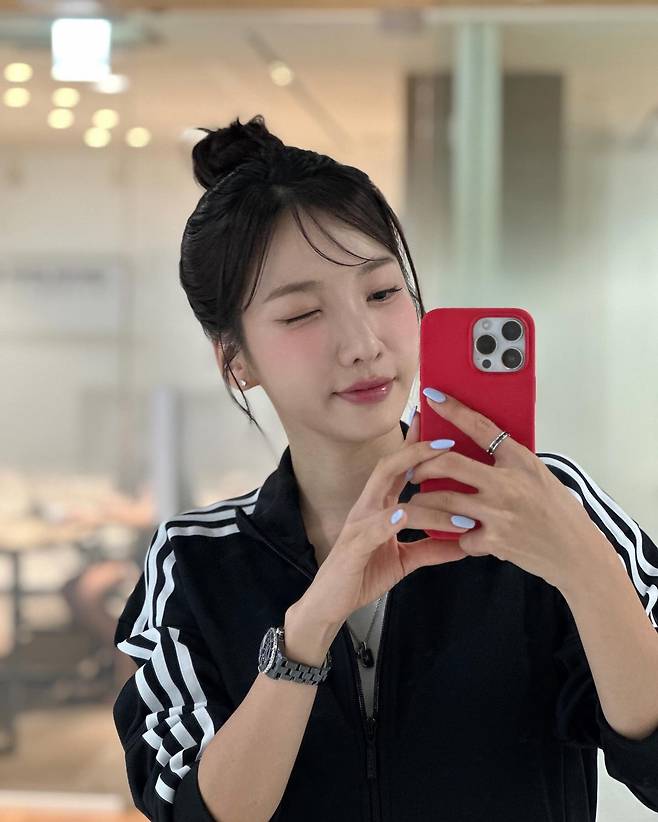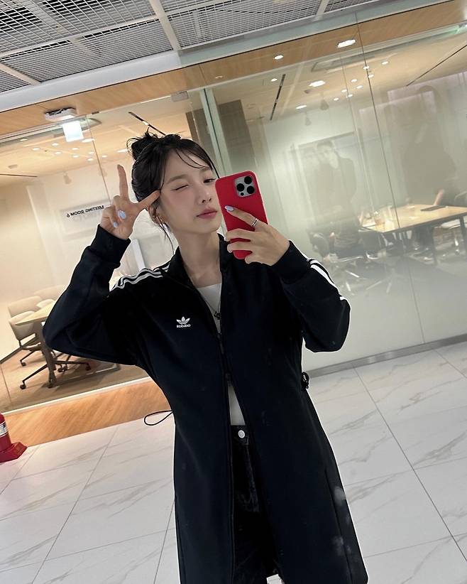지숙은 블랙 아디다스 집업 원피스를 단정하게 스타일링했어요.