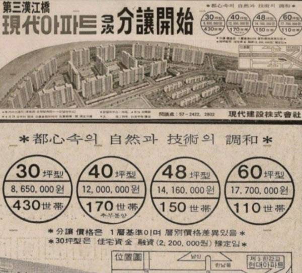 1976년 첫 분양 당시 분양가격은 48평형 기준 1416만원으로 평당 28만원정도였다. 당시 초임 공무원 1년 총급여는 약 48만원으로 추정되는데, 이와 비교하면 당시에도 매우 높은 가격이었다. 당시 초임 공무원이 연봉을 전혀 쓰지 않고 약 29년 모아야 하는 금액이다.