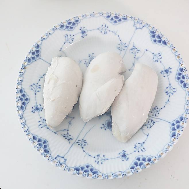 이제 닭가슴살을 꺼내 한 번 썰어보세요.
