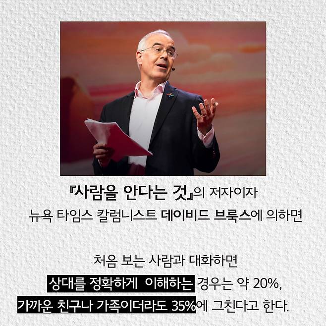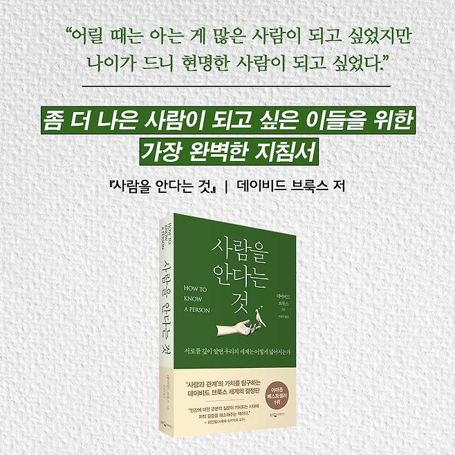 『사람을 안다는 것』의 저자 데이비드 브룩스는 "다른 사람을 깊이 아는 것 자체가 도덕적 행위"라고 말한다.
