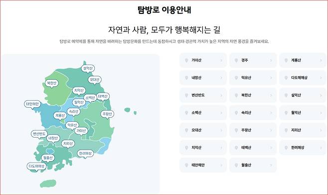 인원 제한이 있으니 인기 구간(내장산, 북한산, 주왕산 등)은 조기 마감 필수 확인!