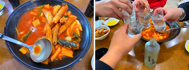 저희 팀은 국물떡볶이와 모둠튀김을 시켜 먹었는데 맛은 평균 정도였습니다. 한 가지 아쉬운 건(사실 저만 아쉬운 부분) 소주는 화요와 일품진로만 판매 중이어서 저같이 그냥 소주 마시는 사람에게는 쪼금 아쉬웠습니다. 화요는 17도, 25도, 41도까지 종류별로 판매하고 있었습니다.