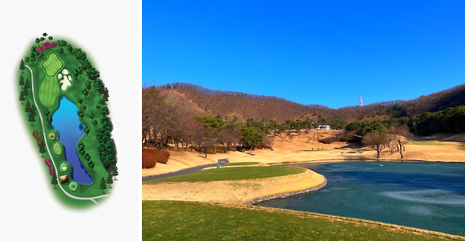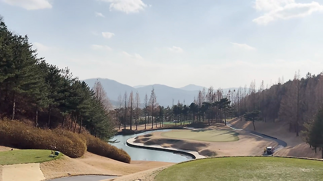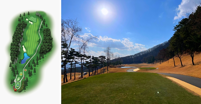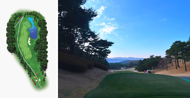 310m 전장의 짧은 미들 홀로 우측은 OB 구역입니다. 이 홀은 대회 때 사진 오른쪽에 보이는 아일랜드 형태의 티잉그라운드에서 플레이해서 화면으로 잡히면 티샷이 이쁘게 잡히는 곳입니다.