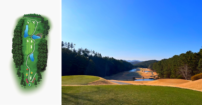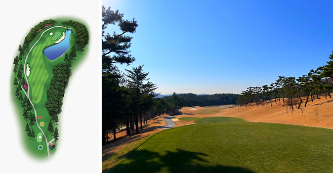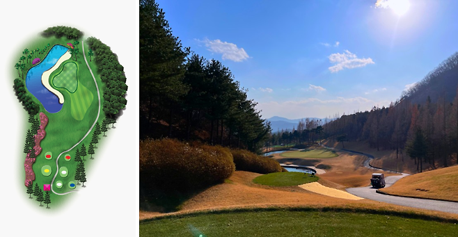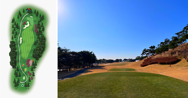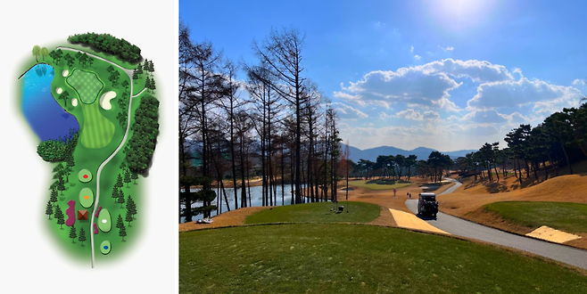 우측이 OB 구역이라 안전하게 좌측으로 플레이했을 경우 경사 때문에 핀이 안 보일 수 있거나 라이가 안 좋을 수 있으니 유의하셔야 합니다.