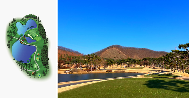 130m 전장의 내리막 파3 홀로 그린 좌측에 벙커와 해저드가 자리 잡고 있어 핀 위치와 상관없이 안전하게 그린 중앙이나 우측으로 공략하시면 좋습니다.