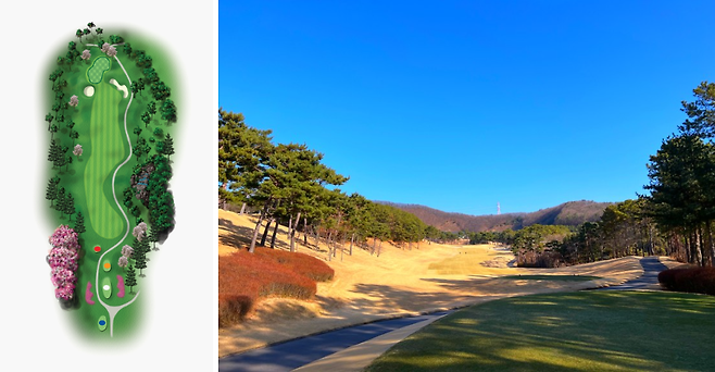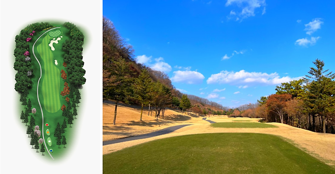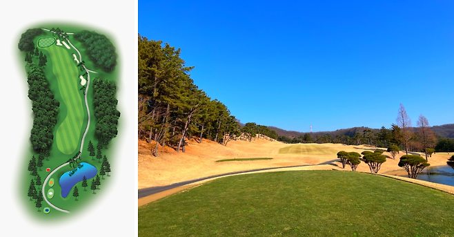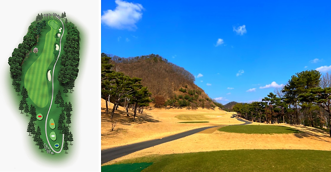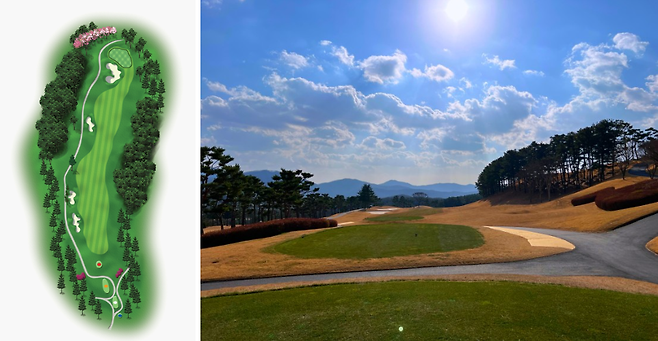 320m 전장의 좌 도그렉 미들 홀로 우측은 OB 구역입니다. 페어웨이 중앙이나 좌측으로 공략하시면 좋습니다.