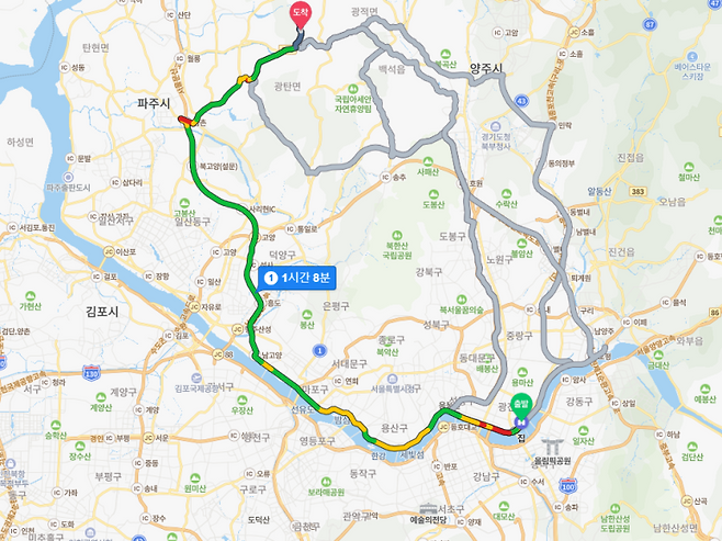 서울에서 55 - 65km 정도 거리에 위치해있습니다. 고속도로에서 나와 국도로 꽤 많이 들어가야 하는 건 아쉽지만 신호도 없고 차도 많지 않아 부담스럽지는 않습니다.