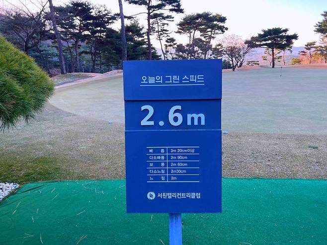 서원밸리 cc 스타트 지점에 이날 그린 스피드가 2.6m라는 별도의 공지가 있었고, 이날 그린 스피드 체감상 공지와 마찬가지인 2.6m로 보통 빠르기 수준이었습니다. 그린에 그늘진 부분이 없이 모든 홀에서 거의 비슷한 스피드를 보였습니다. 시즌 때는 3.0m 이상 그린 스피드를 만든다고 하는데, 겨울에 방문해 너무 아쉬움이 컸습니다.