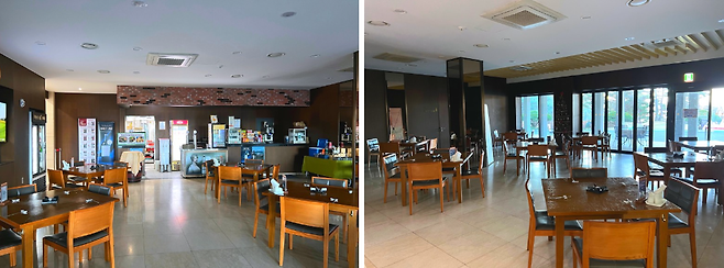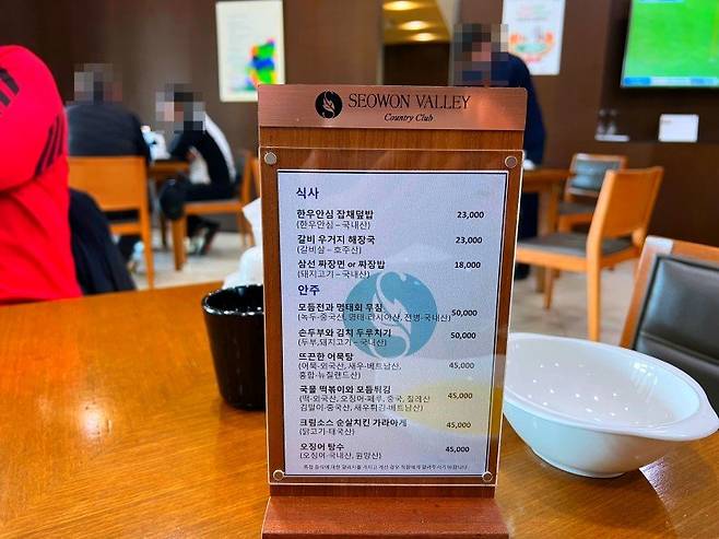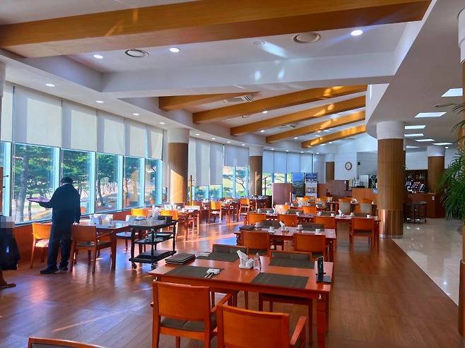서원밸리 cc의 대식당은 리셉션과 같은 층에 위치해있고 깔끔한 분위기에 스타트 지점을 바라볼 수 있게 전면창이 설치되어 있습니다.