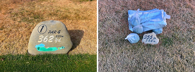 각 홀마다 티잉그라운드에 별도의 코스 맵이 그려진 안내판이 있는데 특이하게도 화이트 티 기준으로 거리가 표시되어 있었습니다. 각 티잉그라운드 별로 그린 중앙까지의 거리가 적힌 표시 비석이 있었고 서원밸리 cc는 블랙 티가 없이 블루 티와 화이트 티만 있습니다.