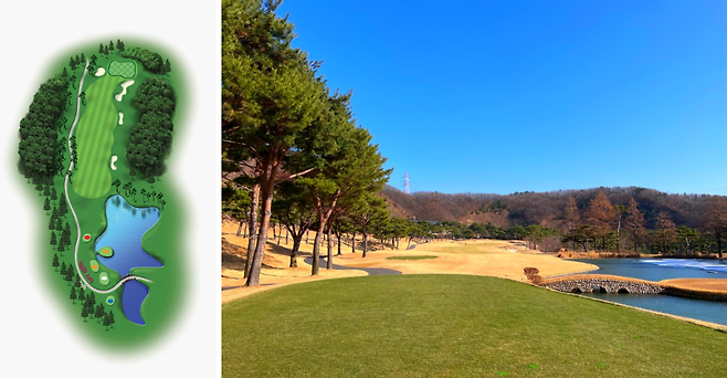 120m 전장의 파 3홀입니다. 그린 좌측에 벙커와 해저드가 자리 잡고 있어 핀 위치와 상관없이 그린 중앙을 공략하면 좋습니다.