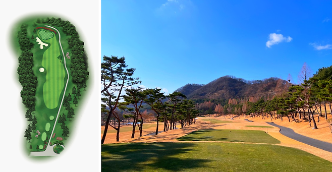 340m 전장의 우측 OB인 미들홀입니다. 핸디캡 3번이기도 한 3번 홀은 랜딩 존이 넓지 않아 정확한 티샷을 요구하는 홀입니다.