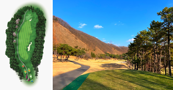 360m 전장의 우 도그렉 미들홀입니다. 좌측은 OB 구역이고 우측은 플레이 가능 지역이라 OB가 나지 않게 페어웨이 중앙이나 우측으로 공략하면 좋습니다.