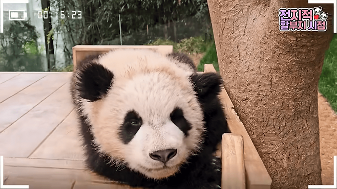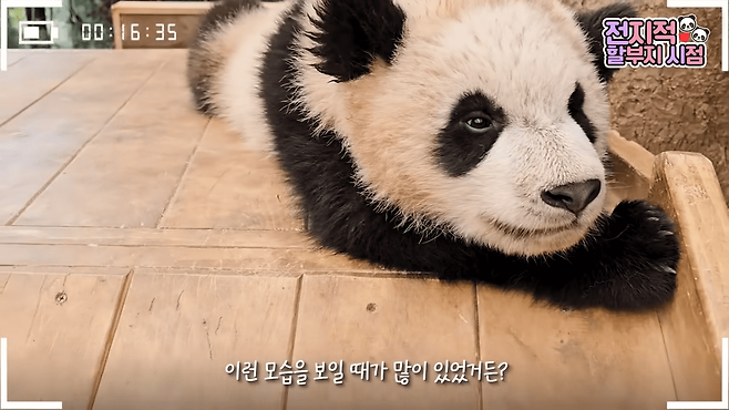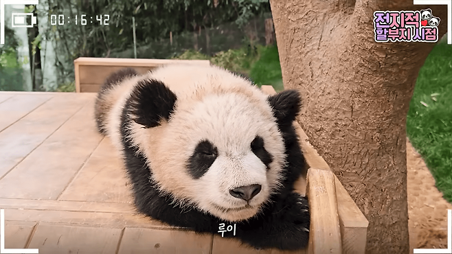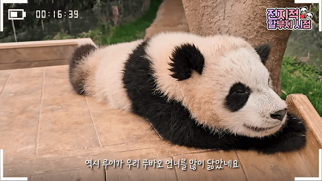이런 모습은 지난 18일 유튜브 채널 '말하는동물원 뿌빠TV'에 올라온 '전지적 할부지 시점 ep.188'에서도 확인할 수 있었습니다. 이날도 루이바오는 신나게 놀다가 흙투성이가 되어버렸습니다. 그리고는 좋아하는 미끄럼틀 위에 올라가 곤히 잠에 들었습니다.