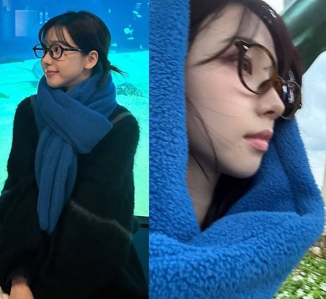 공개한 사진에서 카리나는 뿔테 안경에 파란색 머플러를 하고 블랙 코트를 매치한 나들이룩으로 신비스러우면서도 시크한 나들이룩을 완성했다.