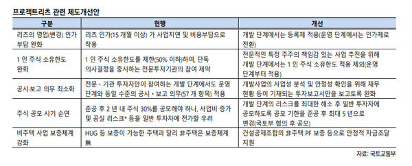 정부는 금융권의 PF 리스크 관리 강화와 PF 사업의 자본확충에 초점을 맞추고 제도 개선을 추진 중이다. 자본 확충과 관련해서는 현물 출자시 양도차익 과세납부 이연 등을 통해 PF 자기자본 비율을 제고하는 안과 함게 개발사업 중심의 프로젝트리츠 제도 도입도 고려되고 있다.