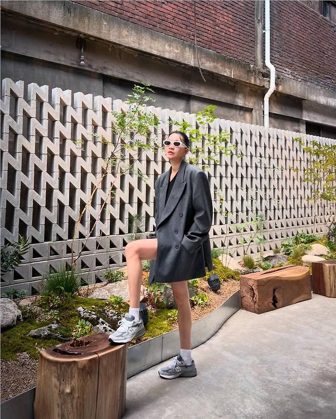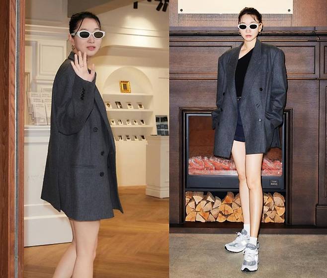 장윤주는 오버사이즈 그레이 블레이저와 미니 쇼츠를 매치해 시크하고 도회적인 분위기를 연출했습니다.