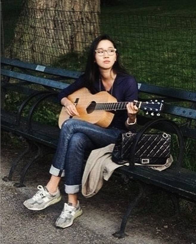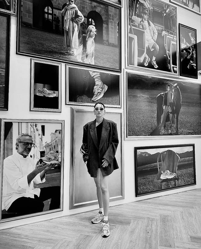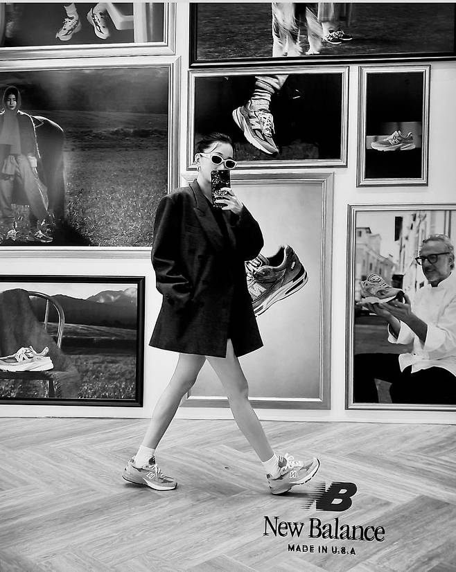 여기에 장윤주는 캐주얼한 회색 운동화를 신어 편안하면서도 트렌디한 코디를 완성했습니다.