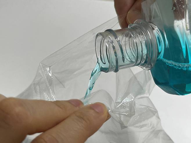 손가락 다섯 개 칸에 골고루 가글 용액이 들어가도록 부어 주세요. 비닐 장갑을 고정시킨 후 용액을 부어서 진행하면 더 편합니다.