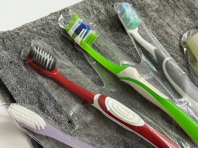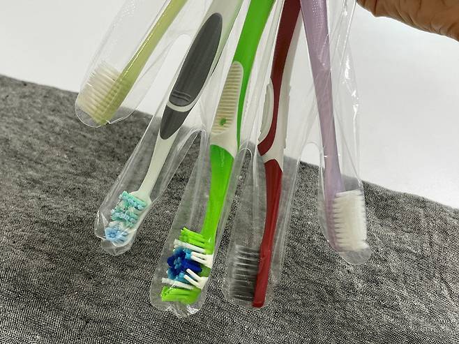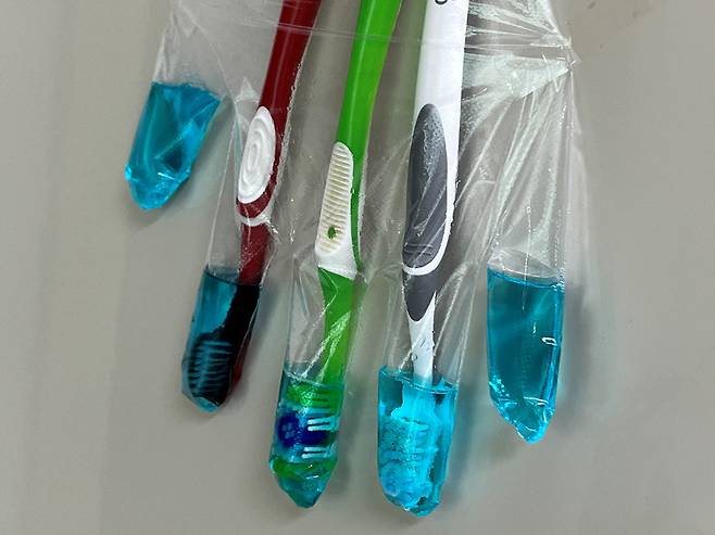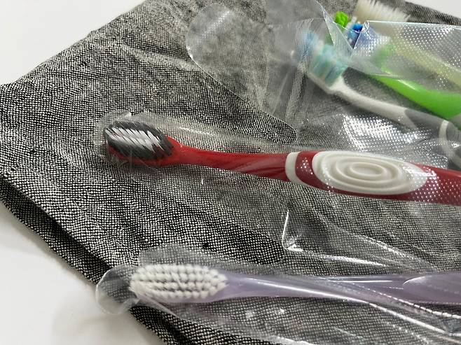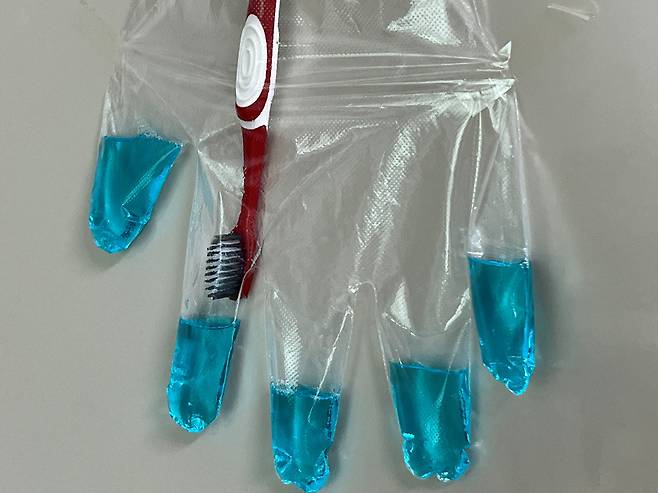 장갑 하나에 칫솔 5개까지 넣을 수 있습니다. 칫솔 케이스는 부피가 크지만 비닐장갑은 훨씬 부피가 덜 나가 자리 차지도 덜 합니다.