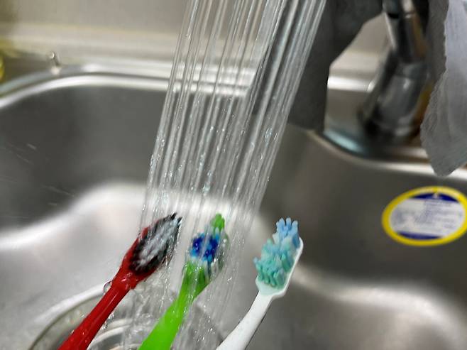 시간이 다 되면 칫솔을 꺼낸 다음 물로 깨끗하게 헹굽니다. 그리고 통풍 잘 되는 곳에서 물기를 말려 주세요.