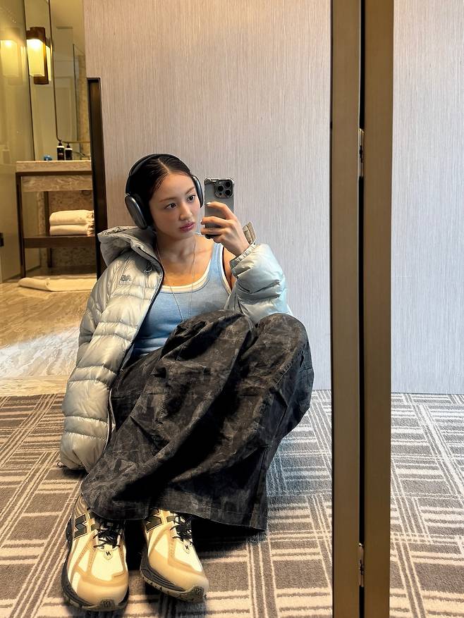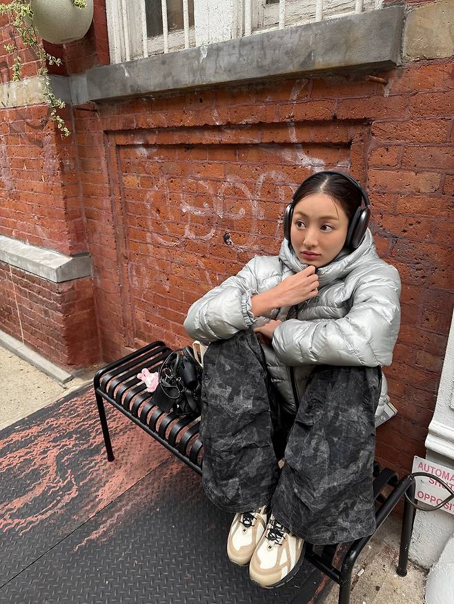 은은한 광택이 도는 실버 숏 패딩에 빈티지한 워싱의 와이드 카고 팬츠를 매치해 자유분방하면서도 탄탄한 실루엣을 보여주었는데요.
