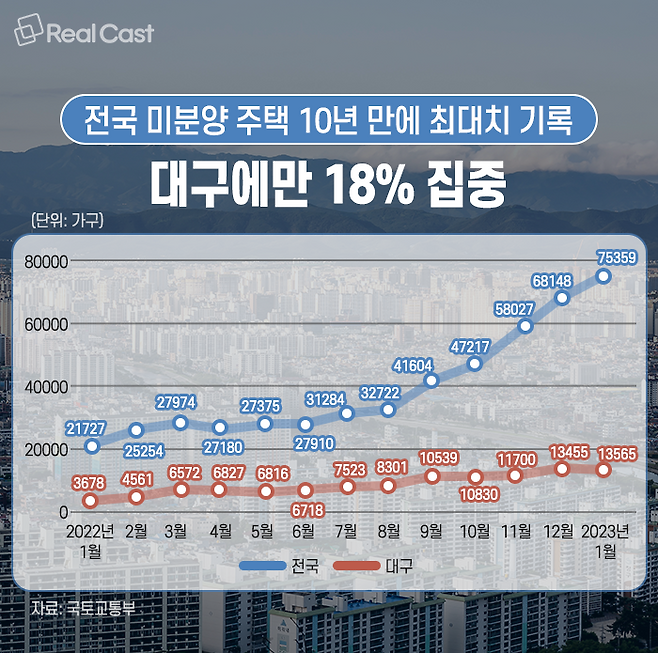 특히 대구는 전국에서 가장 많은 미분양 물량을 보유하고 있습니다. 올해 1월 대구 내 미분양 물량은 전월 대비 0.9% 증가한 1만3,565가구에 달합니다. 이는 전국 미분양 물량 중 18%나 차지하는 것으로, 전국 미분양 물량의 1/5 가까이가 대구 한 도시에 몰려 있다는 거죠.