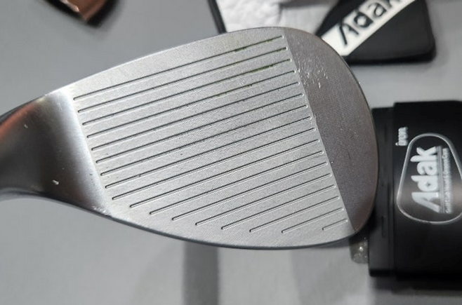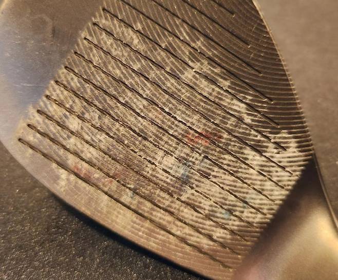 얼마 전 그루브를 새롭게 밀링 한 샌드웨지 페이스입니다. 보다시피, 날카롭게 새워진 흠 사이에 엄청난 이물질 및 골프공 커버가 끼여있는 게 보입니다. 과연 이처럼 눌어붙어있는 것을 물과 브러시 없이 치울 수 있을지 강력한 의문이 들었습니다.