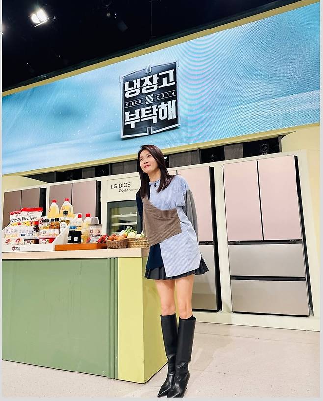 여기에 플리츠 미니 스커트와 롱부츠를 매치해 시크하면서도 트렌디한 분위기를 자아냈습니다.