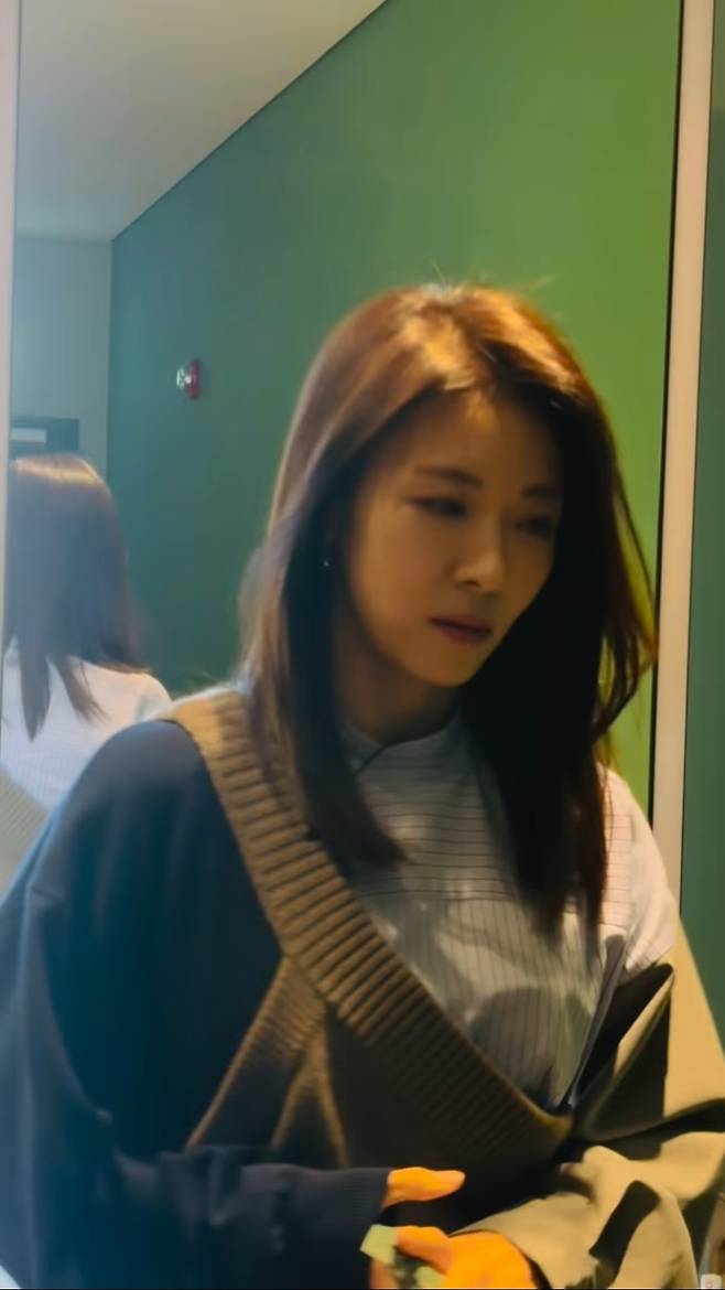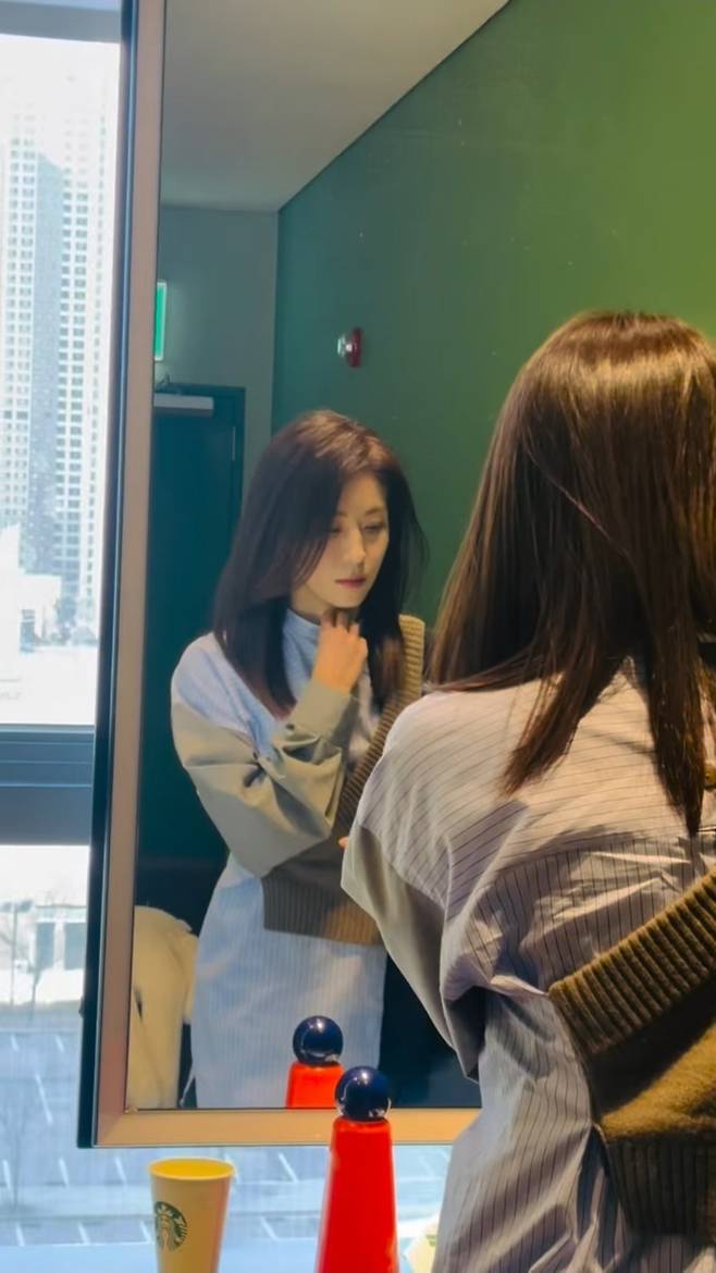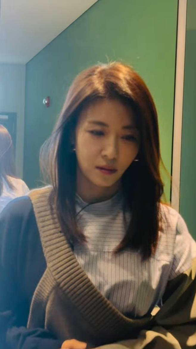 하지원은 스트라이프 셔츠 원피스에 니트 크롭톱을 레이어드한 감각적인 스타일링을 선보였습니다.