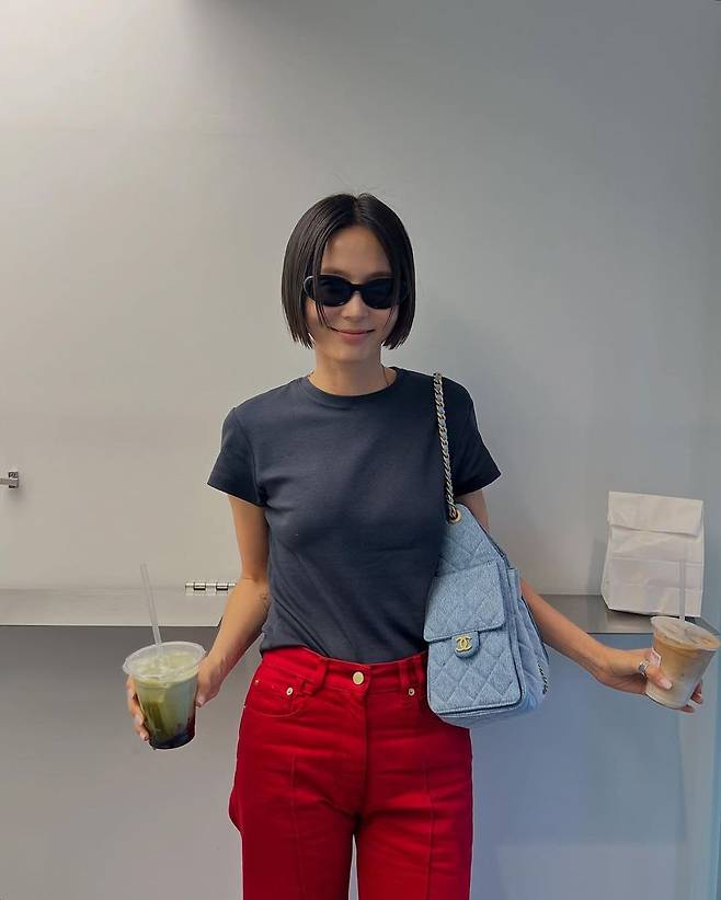 가장 눈에 띄는 포인트는 단연 그녀가 들고 있는 연청 컬러의 샤넬 백이다. 시원한 컬러감의 데님 백은 레드 팬츠와 대비되며 더욱 산뜻한 인상을 주고, 동시에 고급스러운 분위기를 유지한다. 여기에 골드 체인 디테일까지 더해져 ‘꾸안꾸’ 스타일의 정석을 보여준다. 실제로 네티즌들은 “역시 김나영, 컬러 조합 장인”, “이 조합 따라 입고 싶다”는 반응을 보이며 그녀의 스타일 감각에 감탄을 보냈다.