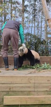 마침내 게임이 끝나자 송바오는 열심히 따라온 손녀에게 "우리 루이 정말 잘했어!"라는 듯 작은 당근을 건네며 다정한 눈빛을 보냈습니다.