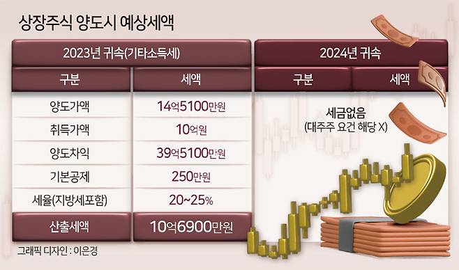 A. 양도소득세 때문입니다. 올해부터 상장주식 기준 보유액 50억원 이상, 지분율 1% 이상일 경우 양도소득세를 내야 합니다. 하지만 세법 개정 전인 지난해에는 대주주 기준이 보유액이 10억원이었습니다. 해가 바뀌면서 약 10억원의 세금이 절약된 셈이네요.