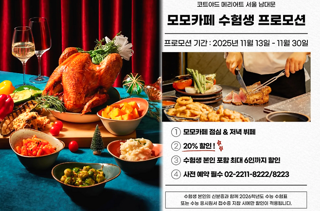코트야드메리어트서울남대문 ‘모모카페’는 30일까지 수험생 포함 최대 6인까지 점심·저녁 뷔페 20% 할인 이벤트를 운영합니다. 수험표나 접수증만 있으면 되기 때문에 시험 직후 부모님과 외식 계획을 잡는 경우가 많아졌어요.