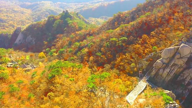 햇빛에 반사된 단풍잎은 수묵화 위에 채색을 더한 듯 환상적인 풍경을 자아내며, 가을 산행의 백미를 선사한다.