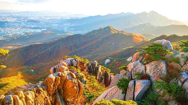 굳이 멀리 떠나지 않아도 가을의 진심을 만날 수 있는 곳 서울 도심과 맞닿은 북한산국립공원은 지금, 단풍이 붉게 타오르는 절정의 시기를 맞았다.