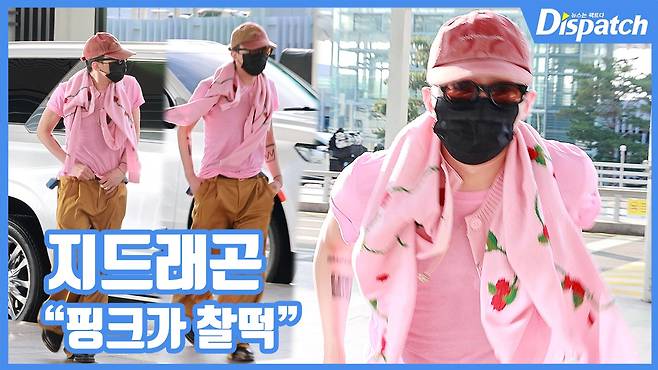 이날 지드래곤은 핑크 헤어 컬러부터 핑크색 캡 모자, 티셔츠, 스카프까지 핑크 톤 룩으로 남다른 패션 센스를 보여줬다.
