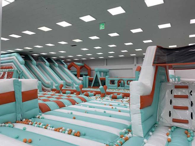 이곳의 가장 큰 자랑거리는 약 500평 규모의 초대형 에어바운스입니다. 에어슬라이드와 볼풀장, 각종 장애물 등이 한꺼번에 어우러져 있어 뛰놀기 좋아하는 아이들에게는 그야말로 꿈 같은 놀이터입니다. 발 닿는 곳마다 푹신한 바닥이 깔려 있어 안전성이 높고, 원색이 아닌 부드러운 민트 컬러로 디자인되어 시각적으로도 깔끔해 보입니다. 주말에도 여유롭게 즐길 수 있을 정도의 넉넉한 공간이 특징입니다.