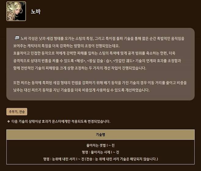전승 발키리는 영광의 검과 빛의 심판 재사용 대기시간을 줄이고 기술 피해량도 상향시킨 모습. 위자드와 위치의 전승 기술들도 피해량이 증가해 기분좋은 상향을 받았다. 전승 격투가 상향으로 마무리됐다. 각성 노바는 왕실 검술 : 습 기술 공격 범위가 축소되고 재사용 대기 시간이 3초에서 5초로 증가했다. 왕실 검술 : 연도 공격 범위가 축소되고 재사용 대기 시간도 4초에서 6초로 증가 등 전체적으로 기술 재사용 대기 시간을 증가 시키며 범위도 축소됐다.