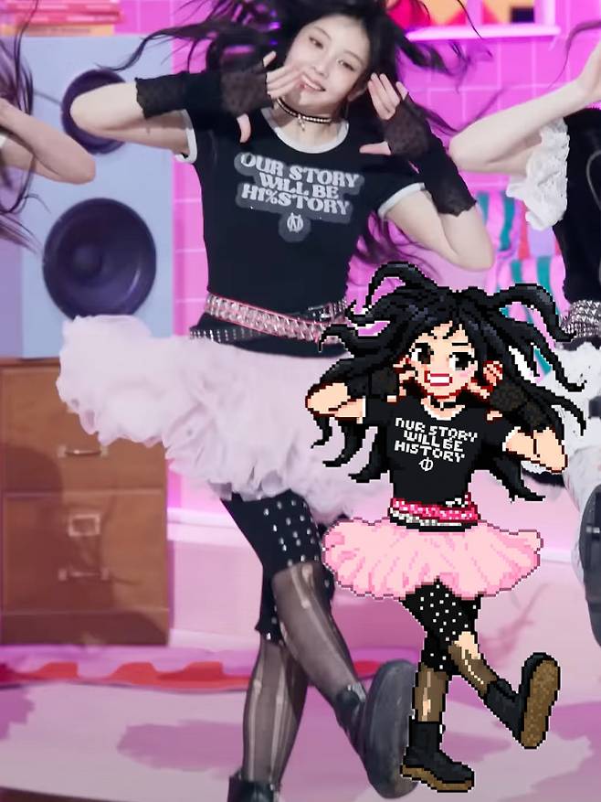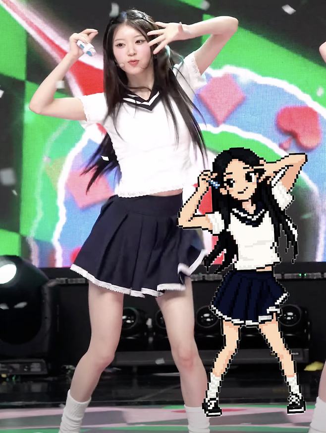 “Everskies 스타일의 전신 픽셀 아트 일러스트를 작성해줘. 인물의 체형, 얼굴 표정, 복장과 헤어스타일 표현 방법을 따라해줘 첨부 이미지 인물의 헤어스타일, 복장, 액세서리를 참고하여 흰색 배경에 전신 일러스트를 그려주세요. 픽셀 아트풍의 도트 그림 스타일로 게임 캐릭터처럼 아기자기하게 마무리해줘.”라고 구체화하는 것도 좋은 방법입니다.