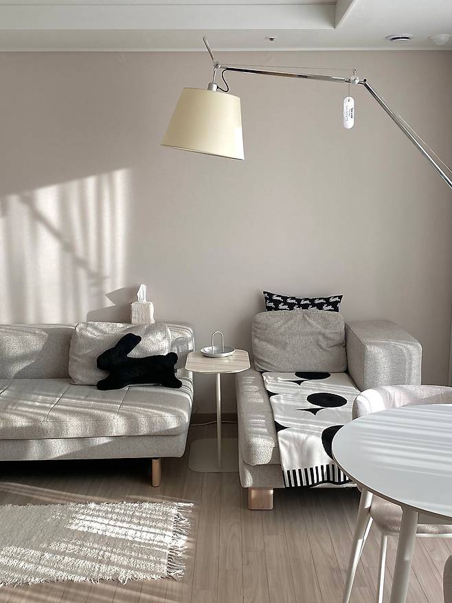 또 저희 부부는 모듈 소파의 장점을 최대한 활용하려고 해요. 필요에 따라 분리하고, 필요에 따라 붙여 쓰면서요. 이렇게 하면 공간을 생활에 최적화해서 사용할 수 있는데요. 사이드 테이블도 소파 사이에 끼워서 사용할 수 있도록, 얇은 철제 다리를 가진 제품으로 선택했답니다. 덕분에 공간 활용도가 더 높아졌어요!