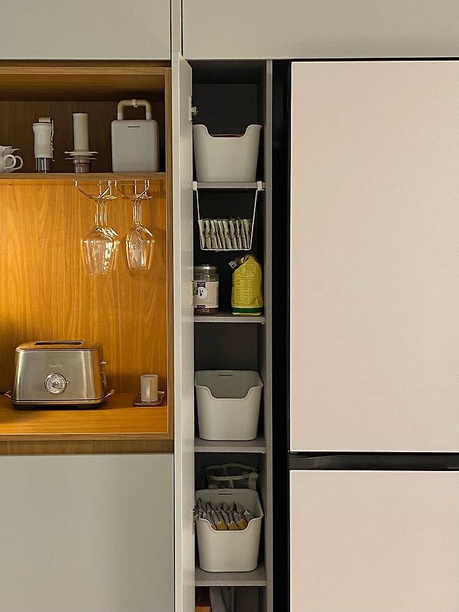 홈바와 냉장고장 사이의 작은 틈새에 작은 팬트리를 만들었어요.