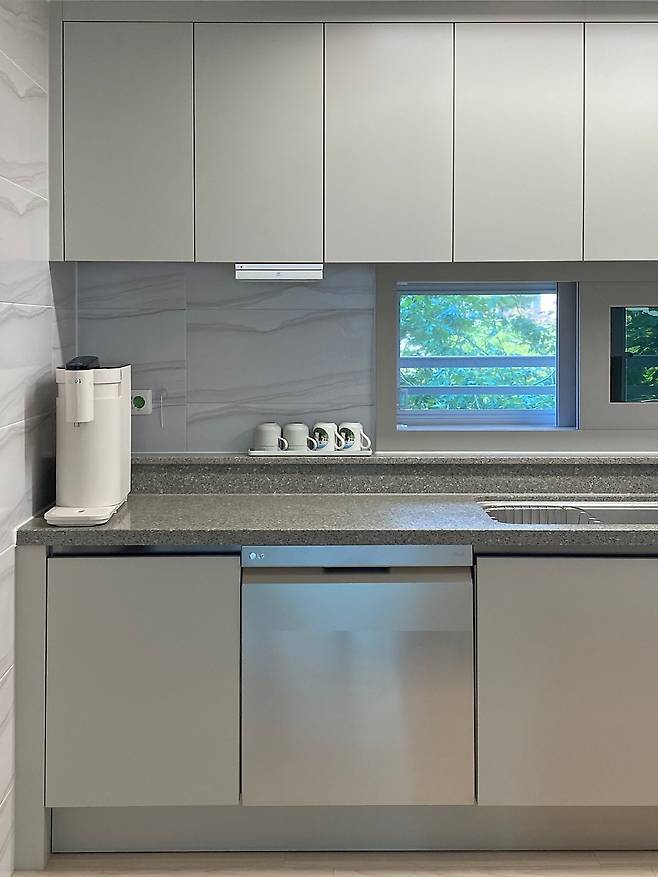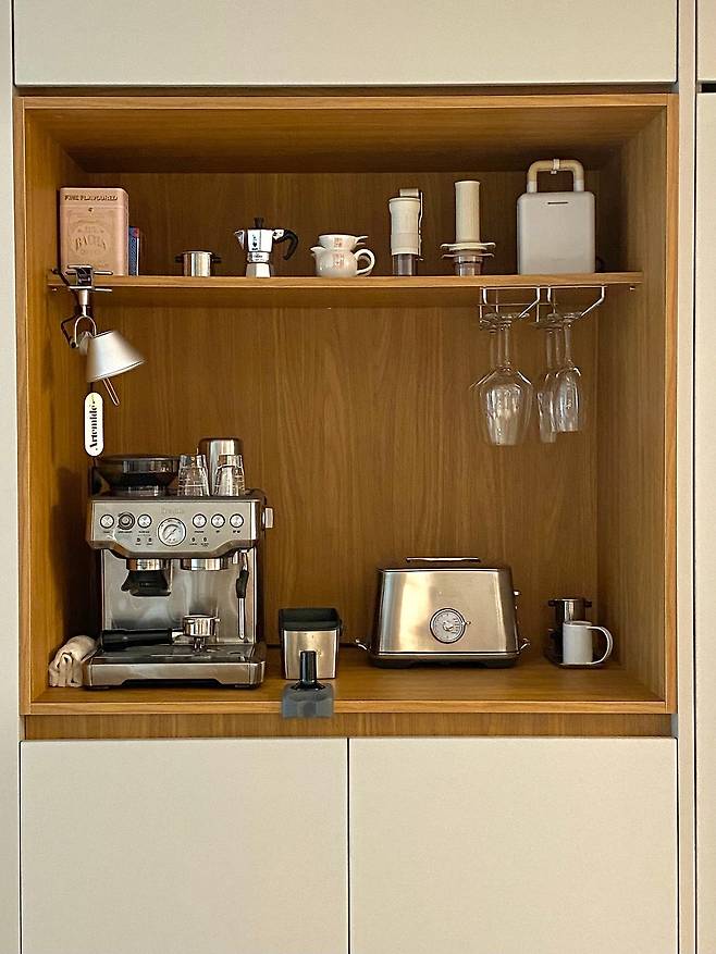 커피와 와인을 좋아하는 부부의 취향을 반영해서 냉장고장에 만든 홈 바예요. 커피 머신과 와인랙이 있는 부분은 우드 톤 자재로 바꾸고, 나머지는 기존의 수납장에 컬러를 맞춰주었습니다. 덕분에 공간이 한층 더 따뜻해 보이는 것 같아요.