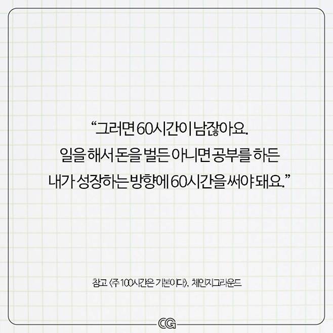 신박사님은 주 100시간을 하는 사람들은 뭔가를 따라잡고 싶은 사람이라고 말한다. 정량적으로 봤을 때 생계를 위해 일하는 시간인 40시간을 제외하고 60시간은 자기 계발 등 나의 성장에 투자해야 한다. 여기서 핵심은 잠을 7시간씩 충분히 자는 것이다. 잠은 뇌를 청소해주고 컨디션을 다시 올려주는 보약이기 때문이다.